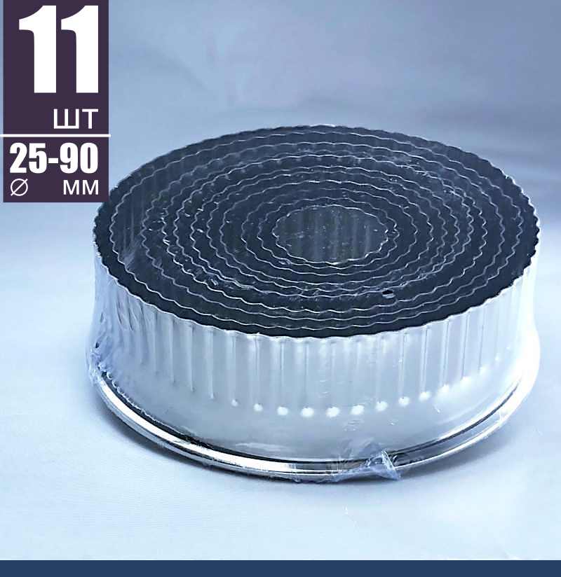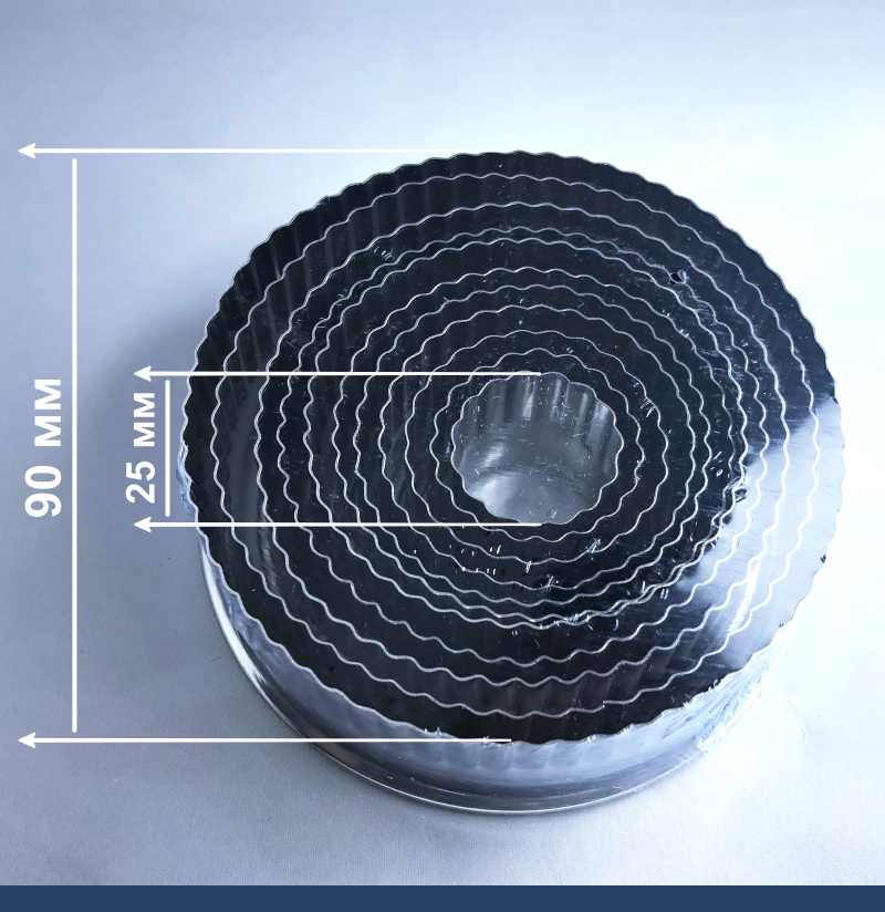 Вырубки для печенья, пряников, шоколада, мастики, марципана или теста набор из 11 шт колец с рифлением в форме цветка диаметром от 25 до 90 мм, высота 30 мм. Этот набор станет вашим надёжный кулинарным помощником. Универсальный набор вырубок, формы имеют широкий спектр применения, подходят для сборки мини пирожных, бенто или муссовых тортов, а так же для сборки салатов. Набор круглых вырубок легко купить в нашем магазине.