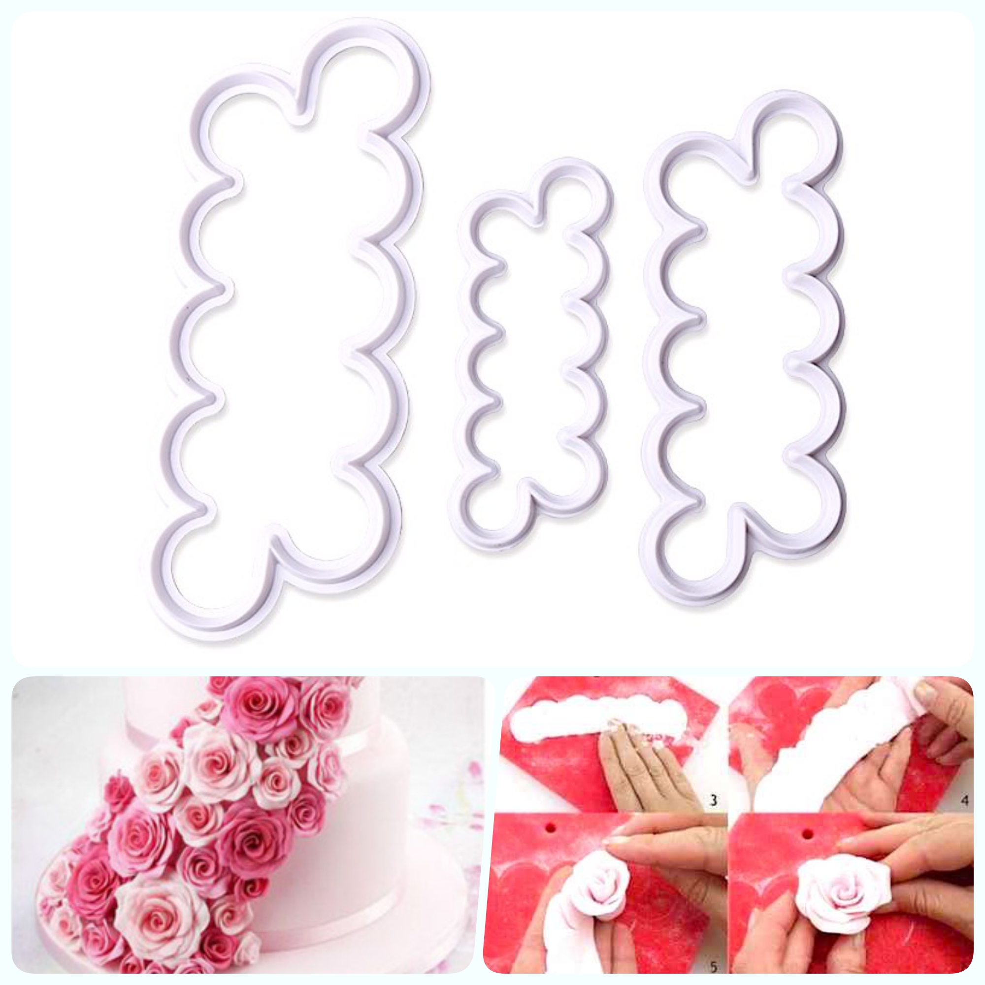 Сделать розу из сахарной мастики для украшения своей выпечки, теперь как никогда просто! При помощи набора из 3-х вырубок возможно сделать 12 размеров роз от 15 до 70 мм.