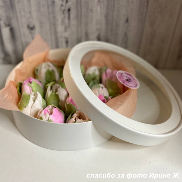 Круглая кондитерская коробка с окном, обычно используется для упаковки десертов, бенто тортов или зефира, сделана из качественного цветного картона. Цвет коробки - нежный розовый.