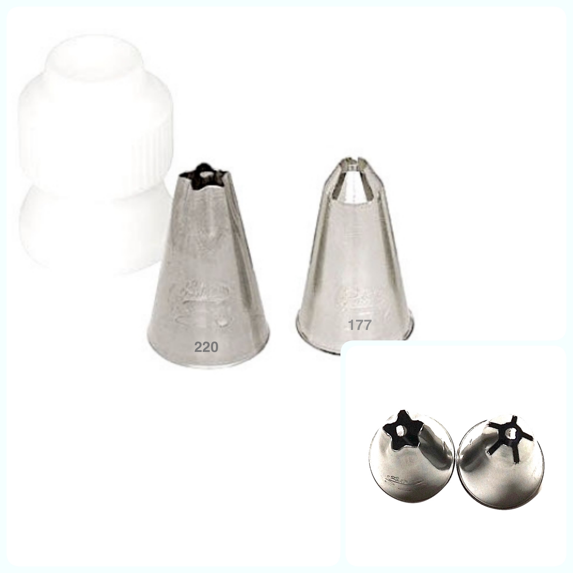 Кондитерские насадки Ateco номера 177 и 220 - это пятилучевые звёзды с закрытым центром. Обычно используются для формирования цветов из крема.