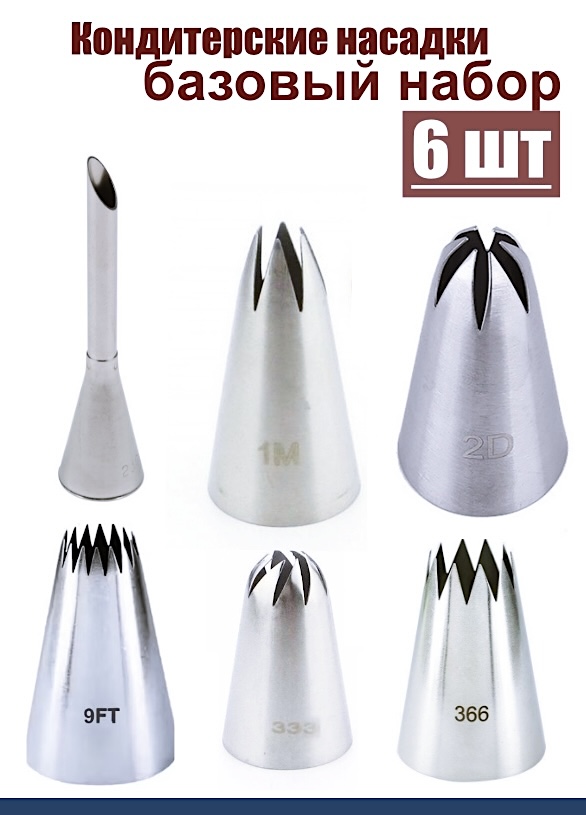 Базовый набор 6шт больших кондитерских насадок: 230, 1М, 2D, 9FT, 333, 366L - легко купить в интернет магазине Мастерская Тюльпан, код для скидки 7% на сайте, жми, хватит переплачивать маркетплейсам.