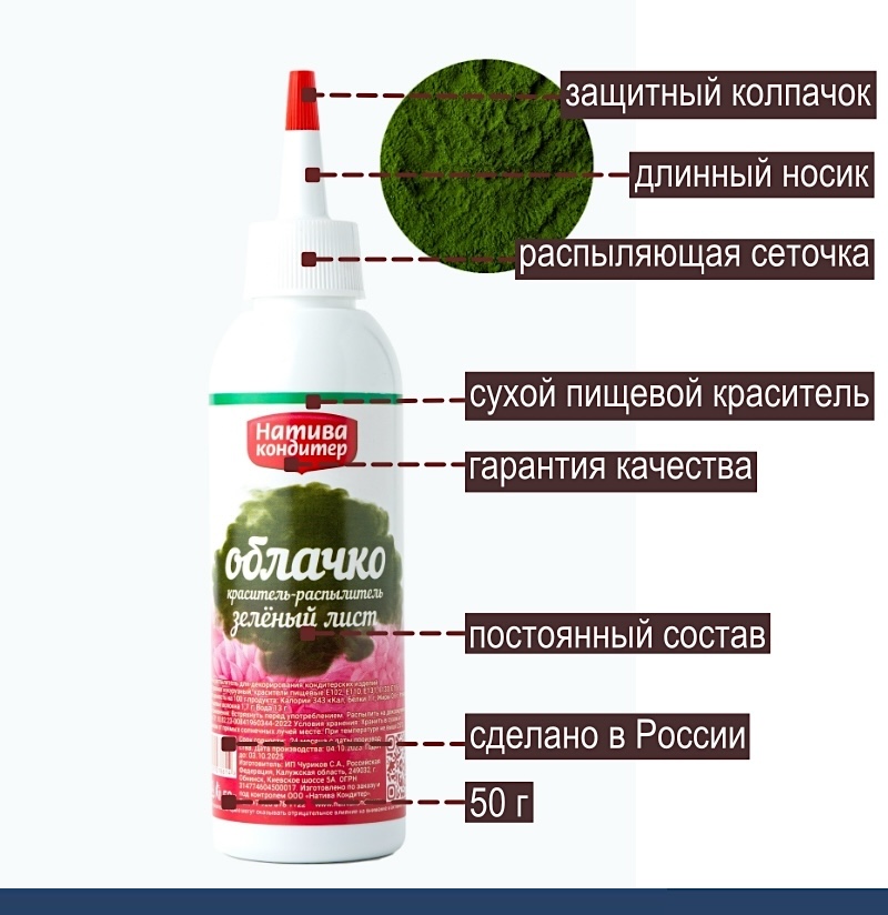 Пищевой сухой краситель с распылителем Зелёный ЛИСТ Пудра 50 г Натива Кондитер Облачко - легко купить в интернет-магазине. Бережно упакуем. Быстро отправим. Промокод для скидки у нас на сайте!
