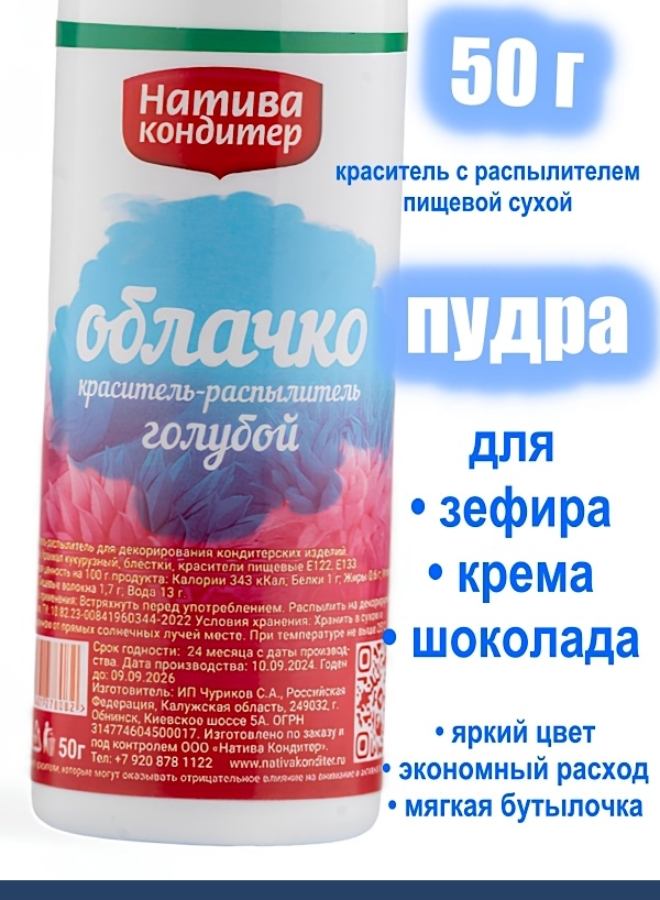 Пищевой сухой краситель с распылителем ГОЛУБАЯ Пудра 50 г Натива Кондитер Облачко - легко купить в интернет-магазине Мастерская Тюльпан. Бережно упакуем. Быстро отправим. Промокод для скидки у нас на сайте!